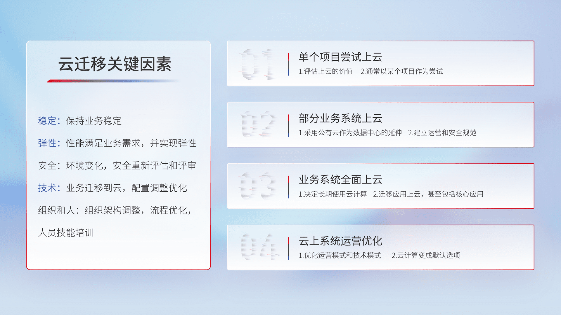 结合实际业务,,,,从规划设计、、、云平台选型、、、云原生改造、、数据迁移、、、集成交付,,,迁移全过程为客户识别最佳上云路径,,,做好风险识别管理,,设计网络架构、、、、身份权限、、、安全审计合规、、、操作审计、、、日志审计、、、、监控告警策略、、多站点容灾设计等,,,,对云上基础设施进行整体规划,,提升IT治理水平,,以满足弹性、、高可用、、高性能的需求。。